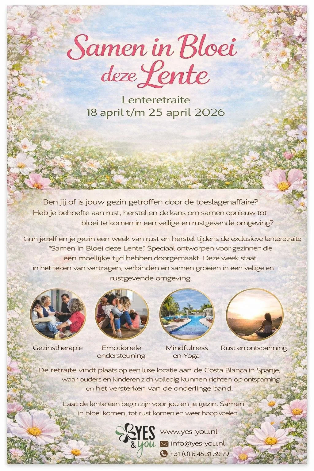 Speciaal voor gezinnen die vastlopen als gezin maar ook individueel begeleiding nodig hebben is er een unieke aanpak inclusief een retreat aan de Costa Blanca. Vind samen rust, herstel en een nieuwe start in een veilige en luxe omgeving, met een programma gericht op het helen van wonden en het versterken van familiebanden.